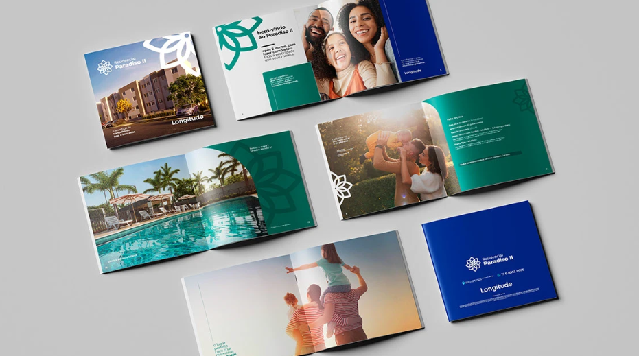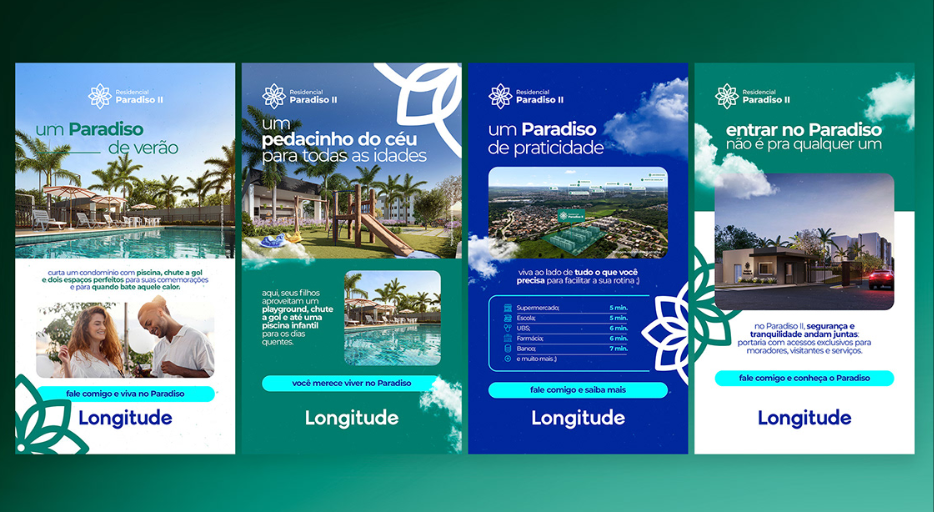 Nos próximos passos, decidimos as cores, elementos gráficos e humanização. Todos remetendo a um novo conceito criativo que reforçava a qualidade de vida/bem-estar e incorporava mais ativamente o nome do empreendimento nas peças produzidas.